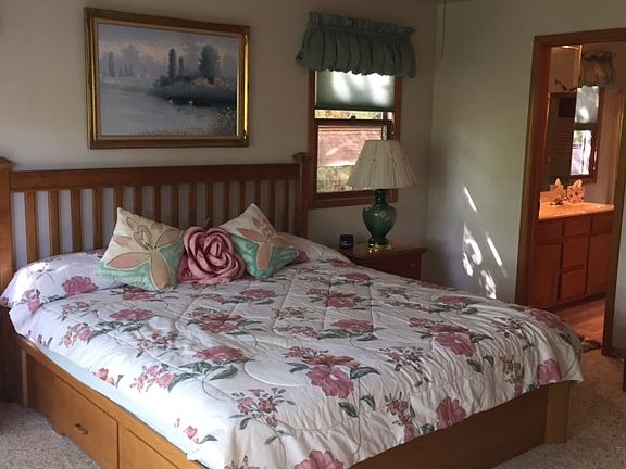 Exceptional 4BR/2.5BA home with 137 feet of riverfront. Custom designed cedar sided tri-level home has open, light and airy split floor plan with elegant interior mix of wood, rock and drywall. Dressed beams and a soaring cedar T & G cathedral ceiling, bay window and stone fireplace enhance a spacious great room. Priced below appraised value.