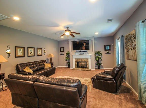- Interior Features: Wall to Wall Carpet, Double Vanity, Entry Foyer, Permanent Stairs, Trey Ceilings, Closet-Walk In