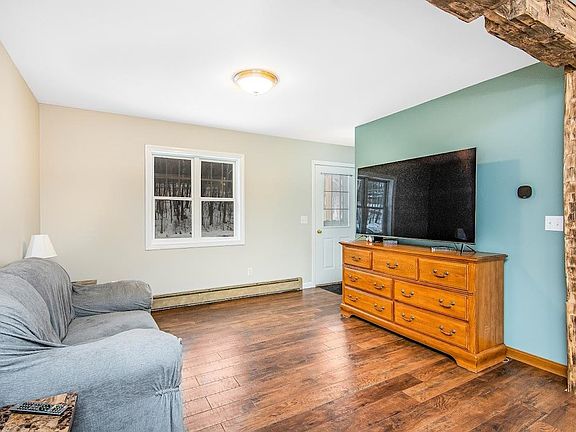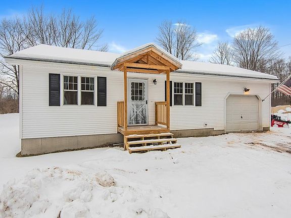 You don't want to miss a MOST ADORABLE, completely MOVE-IN ready one-level home!! This affordable one bdrm/one bath gem has made an ideal retirement home for its former owner, and a wonderful starter home for its current owner! Vast improvements include a new roof, covered front porch, & large 12x16 deck w/hot tub '22! Open floor plan with living room and spacious kitchen/dining area featuring exposed beams, island, and all new appliances '19. New windows and sliding glass door '19, oversized full bath with Bathfitters tub upgrade '19, and brand new laminate flooring, trim, and paint throughout! Exceptional space downstairs includes family room and exercise room, playroom, or office-just needs ceilings! Egress window included for future install. Applianced laundry room with on demand heating system '18, water softener '19. An attached garage and over 2 acres of land round out this wonderful property only mins to I89! This home has been extremely well-maintained and is completely ready for its next owner to love!! Showings begin Friday, 2/17.