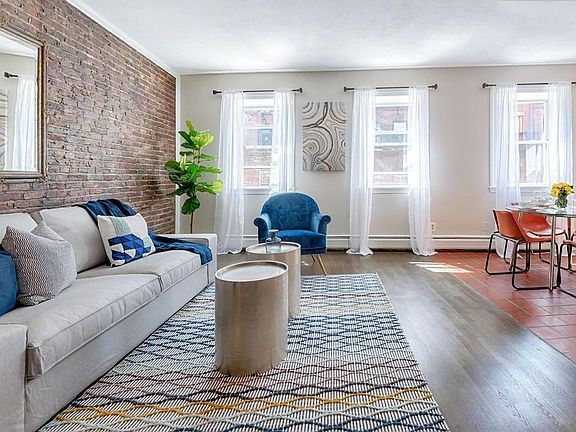 OH Friday 6-7, SAT 2-3, SUN 12-2. Elegant 2 bedroom home located just off North Square! Incredible opportunity! Oversized and open, this charming condo has towering ceilings, an open living room/dining & GORGEOUS dark wood floors. Three large windows overlook historic North Street and the renowned North Street Grille. Fully applianced galley kitchen w/exposed brick wall and butcher block countertop. Large full bathroom with white tile surround and tasteful vanity. Two bedrooms with large windows, exposed brick, new carpet and ample closet space. Laundry & secured private storage in basement. This is a professionally managed condominium with 8/10 owner occupancy!