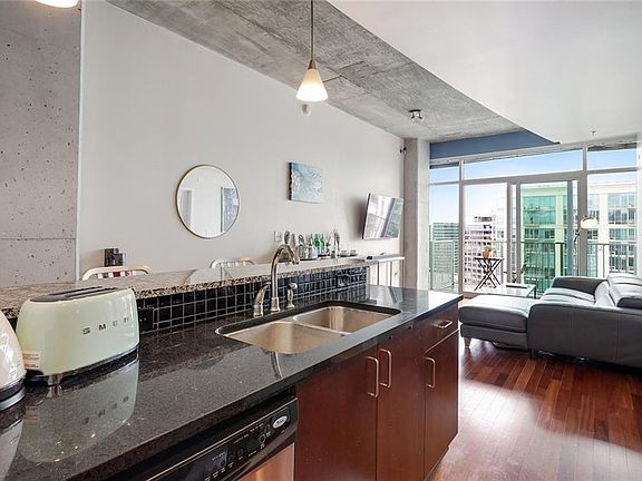 A MUST SEE! Penthouse views without the penthouse price! Unit boasts 10' Exposed Concrete Ceilings, Floor to Ceiling Glass Windows, Hardwood in Kitchen, hallways and living area, New Upgraded Marble Look Floors in Bedroom, Closet, Bathroom and Laundry room. New Custom Closet, Built in Desk, Granite Countertops, SS Appliance and Renewed Balcony Floor. Amenities located 10th floor: Olympic sized Pool, BBQ area & Gym. 24hr concierge. Steps away from dining and high-end luxury retail shops. Trash and Internet also included in HOA!