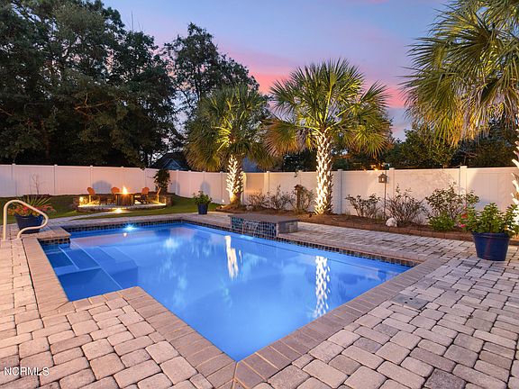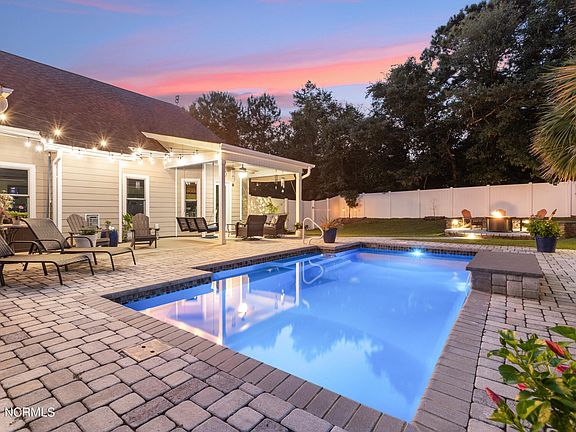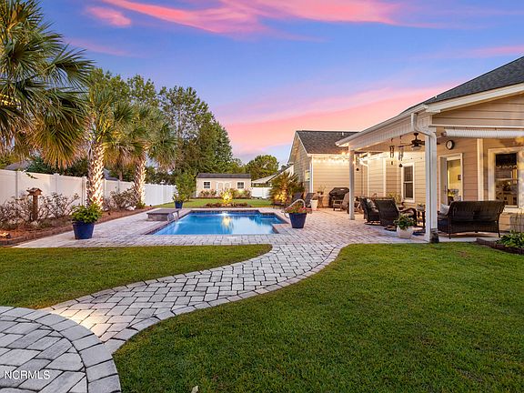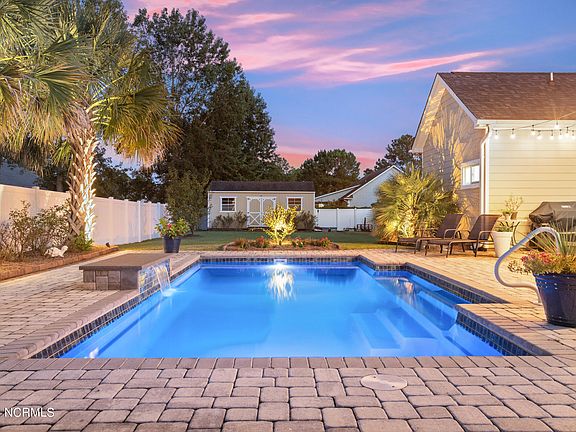 Pinnacle Ridge is a well established neighborhood in Hampstead tucked away from everything but close to the beautiful beaches of Topsail Island and not far from Wilmington.. Just image sitting out by your saltwater pool with a water feature looking over your beautifully landscaped backyard watching the palms trees blow in the wind you can just jump right in the pool and cool off on those hot NC summer days.. Fully fenced in backyard with an easy to maintain vinyl fence. Storage is not an issue with your wired 14x24 shed.. This well designed and laid out home has 4 bedrooms 3 full baths a bonus room & a FROG. What more could you need. As you walk in you will be greeted by beautifull engineered hardwood floors nice size living area with a gas fireplace that looks out to your amazing backyard. Downstairs is 3 bedrooms including the Master with a walk in closet dual vanities soaker tub and walk in shower plenty of space. In between the 2 other bedrooms is a nice size bathroom with dual vanities as well,