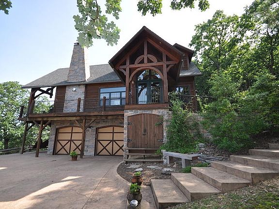 Timber Frame Lake View Home Custom Built by Famous Amish Builder! (Dan Schwartz built Arnie's Barn at Top of the Rock) Open floor plan with wall of windows facing the lake. 2 story rock fireplace, wood beams, cedar plank shingles. Private veranda off master suite, open Kitchen with granite and stainless appliances. Outdoor fireplace surrounded by sitting area overlooking your own waterfall. Heated & cooled workshop could be a 4th bedroom. There is a boat ramp located in the subdivision. 10x24 slip with lift in dock below for an additional $35,000.