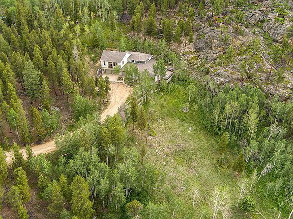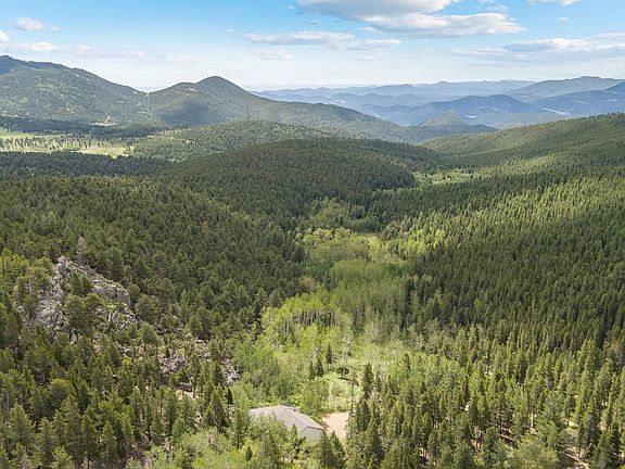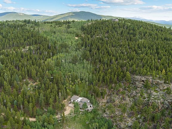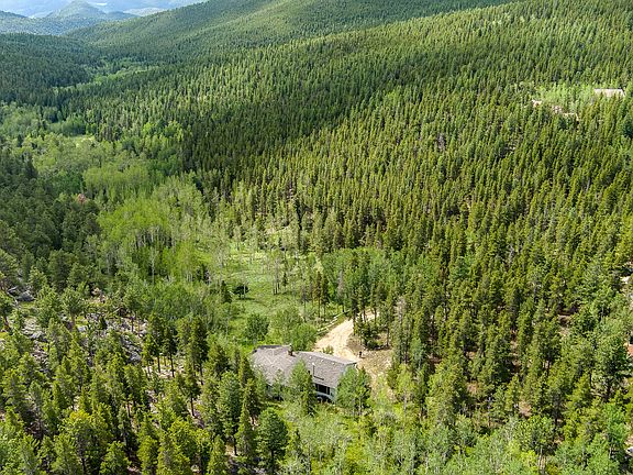 Beautiful mountain home on 35 acres bordering BLM land. Stunning views for miles, nothing but nature. Natural spring that runs year round in the meadow below the home. 3 bed, 2 bath 3300 sq ft open concept main home with amazing views down the valley. New paint inside and outside last month. 800 sq ft flex space above the garage with utility sinks, stove, and external entrance. Could be a huge bedroom, entertainment area, shop!?! The owner's wife used it as a studio - (famous artist with pieces in the Smithsonian!). Two wood burning stoves and radiant floorboard heat. Sitting area off kitchen and main room with wall of windows facing down the valley. Main floor primary bedroom with direct access to the deck. Main floor office with built in shelves and desk. 1 bed, 1 bath cabin about 100 yards up the hill with own driveway and parking, finished interior, and all utilities. Unlimited possibilities here! Great location, 10 minutes to Black Hawk and Central City, 40 minutes to the Denver front range, and an hour to Summit County and world-class skiing. This is a one of a kind mountain home