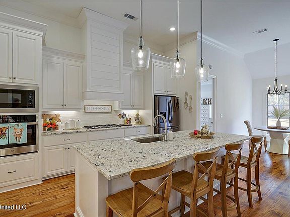 This beautiful home in Northshore Landing is a show stopper! Built in 2022 with 2346 sqft. 4 bedroom 3 bath open plan with large living area, cozy brick fireplace, wood flooring throughout. Come see for yourself this beautiful home situated in a cul-de-sac and backs up to wooded area with a FULLY fenced large private backyard with covered patio perfect for entertaining. UNIQUE to this home additional glass display cabinetry and counter space were added in kitchen! Large granite island, stainless steel appliances, spacious laundry room, bedrooms are all generously sized. Primary bathroom has his/hers vanities, separate tiled shower and tub, huge closet with built-ins. Near the Rez, close to shopping, and in the Northwest Rankin school district. Neighborhood offers a pool with entertainment area and basketball court. Call your Realtor today for a showing.