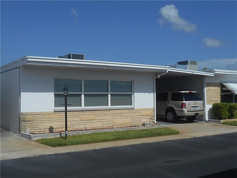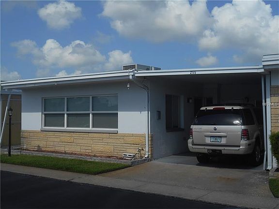 Welcome home to your 1 bedroom, 2 bathroom BLOCK villa with carport in Shang-ri-La. Your comfortable home is solid with NEWER ROOF and A/C. Large living area, big master bedroom and a bonus room that could serve as a 2nd bedroom, all freshly painted. The second bathroom is great for guests or making the 2nd bedroom into a master bedroom. These are BLOCK CONSTRUCTION, villa style homes, built next to each other. You own and maintain your own property keeping maintenance fee lower. Included are large HEATED POOL and Clubhouse, neighborhood maintenance, private road, laundry facility, walking distance to shopping, dining, and more . Come and see the potential.