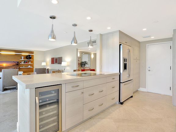Enjoy endless ocean views and fabulous sunsets from this beautiful Marbella residence. 2 bedrooms, 2 bathrooms with open kitchen and 2 private balconies. Floor to ceiling windows in living areas and bedrooms. Custom closets in both bedrooms and hallway. Kitchen is open with breakfast bar and breakfast dining overlooking the ocean. Kitchen offers quartz(caesarstone)counters ,upgraded appliances including ,Monogram induction cook top ,Bosch dishwasher.New AC (2022) and( 2016 )water heater. Other Upgrades are 24 inch limestone/travertine on the diagonal in living areas, new doors, new hardware, and keyless entry. Guest bath has granite counters and shower. Primary bath has marble counters, separate shower and separate tub. Desk area in primary bedroom and custom window treatments. Reduced This unit offers private balcony off master suite to enjoy the beautiful view of Lake Boca and fabulous sunsets. Unit has been customized to allow access to guest bath through guest bedroom. One assigned garage space and lots of guest parking. Washer and Dryer inside unit and wine cooler in kitchen. Marbella offers heated pool with 2 level outdoor space and whirlpool, 24 hour security, newly remodeled lobby, fitness room, card room and party room with catering kitchen. Elevators recently renovated. Unit has impact glass and also shutters to enclose ocean balcony. Building has marina and tennis across the street on lake Boca.