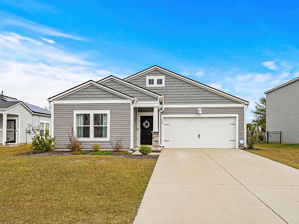 Financing incentive offered! Ask agent for details. Welcome to your dream home in the highly sought-after Beach Village, a charming natural gas community just a few miles from the sparkling shores of Surfside Beach. From the moment you approach this home, you'll be struck by its charming curb appeal. Across the street, a tranquil pond sets a serene backdrop, while the home's elegant design features stacked stone accents around the column, a thoughtfully extended driveway, and gutters. Step inside and be greeted by a stunning interior, where the beautiful flooring flows throughout the open-concept living areas. This home has been designed with both privacy and functionality in mind. To the left, you'll find two generously sized bedrooms, each offering ample closet space and sharing a full bathroom—ideal for family, guests, or a home office. At the back of the home, the luxurious master suite provides a peaceful retreat with an oversized walk-in closet and a private ensuite bathroom. This serene oasis includes a large walk-in shower and dual sinks. At the heart of this home lies the chef-inspired kitchen, designed to inspire culinary creativity. Featuring sleek white cabinetry, gorgeous granite countertops, and stainless steel appliances—including a gas range—the kitchen is as stylish as it is functional. A convenient breakfast bar provides the perfect spot for casual meals, while the pantry offers plenty of storage. The open flow from the kitchen into the dining and living areas makes this space ideal for both everyday living and entertaining. A sliding glass door from the living room lead out to a spacious, fully fenced backyard—your private outdoor oasis. Whether you're grilling with friends, enjoying a peaceful evening under the stars, or creating a garden sanctuary, this backyard has the space and privacy you desire. A shed provides extra storage. The community's HOA fees cover cable, internet, and trash pickup, adding to the convenience and value. Your Surfside Beach address grants you close proximity to all the attractions and amenities of the Grand Strand including fine dining, world-class entertainment, and ample shopping experiences. Rest easy knowing you are only a short drive from medical centers, doctors' offices, pharmacies, banks, post offices, and grocery stores. Square footage is approximate and not guaranteed.
