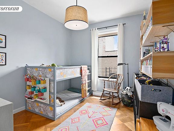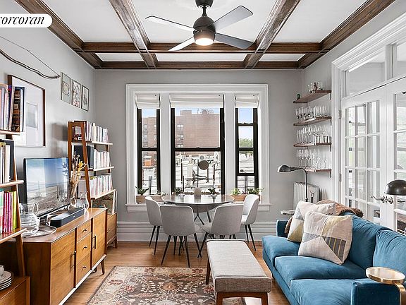 Three flights of stairs bring you to this sunny and quiet rear-facing two-bedroom apartment. The entrance hall -- a perfect canvas for a gallery of photos -- leads to a beautifully renovated windowed kitchen that boasts quartz countertops, tall maple cabinetry, stainless-steel appliances (including an induction range), bamboo floors, a glass-and-stone backsplash, and a large breakfast bar illuminated by three pendant lights and offers under-counter storage and seating for three. The living and dining room are flooded with light from two exposures. The primary bedroom has beautiful French doors that allow additional light to stream in from the living room and a double California Closet. The second bedroom is nicely separated from the rest of the apartment for privacy. Original coffered high ceilings, baseboard moldings, and parquet floors speak to the era of this c.1931 building, a well-run co-op with lush landscaped gardens flanking the entrance. This building is maintained by a live-in super and you'll find laundry, bike storage and storage lockers in the basement, available for a nominal fee. Strollers may be parked in the lobby. With newly installed solar panels for the building, the monthly electrical credit is upwards of $40/month. The building has a healthy reserve with no known capital projects planned. Prospect Park is at your doorstep: Vanderbilt Playground, bandshell concerts and events, tennis courts, skating and boat rentals can be part of your daily routine. And for your dining pleasure, notable nearby restaurants include Le Paddock, Krupa Grocery, East Wind Snack Shop and Double Windsor.