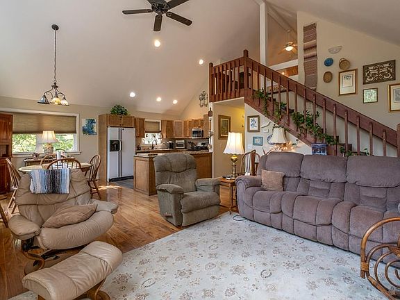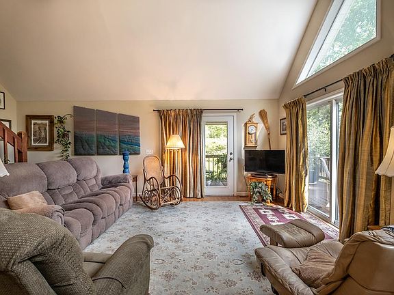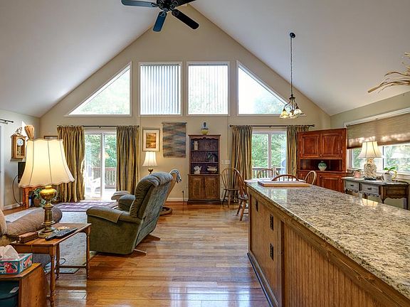 Nestled on over 3 acres of wooded land, this charming 2-bedroom, 2-bathroom chalet offers the perfect blend of comfort, privacy, and natural beauty. Situated on two lots at the end of a quiet road, this home provides the ultimate in seclusion while being surrounded by nature. A paved driveway winds its way through the trees, leading to your private retreat, complete with an outbuilding equipped with power, ideal for storage or a workshop. The home features a lovely outdoor living setup, including a spacious lower-level porch, an open upper-level deck, and a cozy screened-in porch where you can enjoy the tranquility of your surroundings in any season. As you step inside, you're welcomed into a bright and airy Great Room, featuring a vaulted ceiling and beautiful wood floors. Three sets of doors open up to the deck and screened porch, allowing plenty of natural light to fill the space and offering easy access to outdoor living. The open kitchen is perfect for those who love to cook, with ample cabinet space and elegant granite countertops that provide plenty of room for meal prep and storage. The main floor also includes one bedroom and one full bathroom, providing easy living on one level. Upstairs, a cozy loft offers additional space that can have many and varied uses such as a home office, reading nook, or extra storage. The finished basement adds even more living space, featuring a large family room with a gas fireplace and access to the lower-level porch. This level also includes a second bedroom, another full bathroom, a laundry room, and the mechanical room. Additional features of the home include a water filtration system, a dual-fuel heat pump for efficient heating and cooling, and fiber optic internet for high-speed connectivity. The roof on the house, outbuilding, and well was replaced in 2021, giving you peace of mind for years to come. This peaceful, secluded chalet offers everything you need for comfortable living in a private, wooded setting.