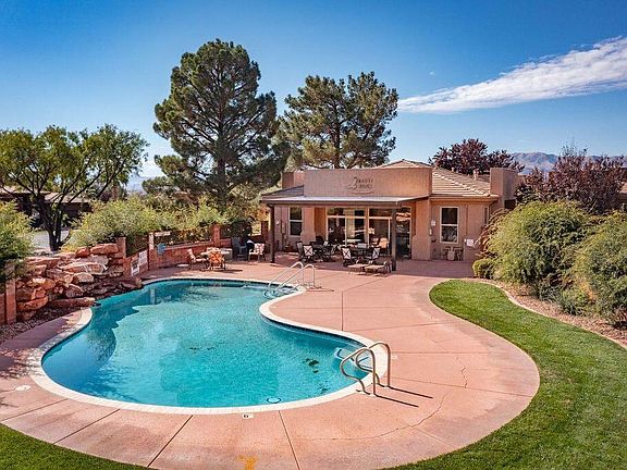 Nestled in the breathtaking red rock landscape of Southern Utah, this stunning home is located in the highly sought-after Eagle Rock community, just a short walk to Snow Canyon State Park and Black Desert Resort. This elegant desert retreat has a thoughtfully designed open-concept layout with expansive windows that capture panoramic views of the surrounding red cliffs. The gourmet kitchen features custom cabinetry, a breakfast nook, and a spacious island. The primary suite is a private oasis, complete with a spa-like ensuite bathroom and walk-in closet. The HOA dues include an outdoor pool, indoor pool, hot tub, clubhouse, workout room, and front yard maintenance.