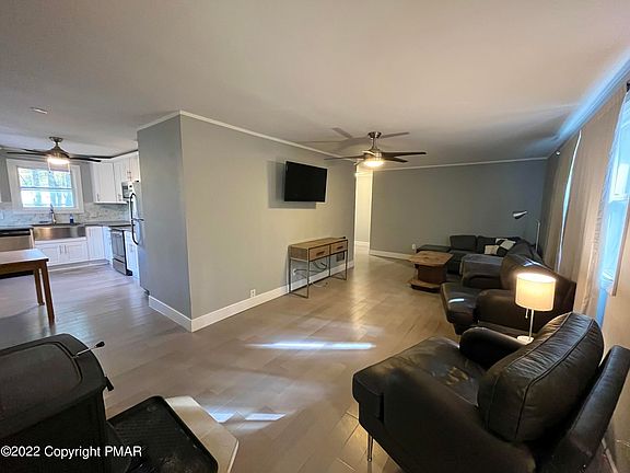 Beautifully renovated 3 bedroom 2 full bath single floor living! Gorgeous stone brick wall fireplace with wood burning stove in living room on one side, formal dining room on the other leading to spacious back deck. Modern kitchen with stainless steel appliances, granite countertops, and plenty of cabinet space. Master suite with beautiful stone designed stand up shower, two additional bedrooms, updated main bath with stackable washer and dryer. New roof just installed, new storage shed, many unique updates throughout. Close to all desired Pocono Mountains attractions ready for you to call home, your mountain getaway, or option to use as AIRBNB in Stillwater Estates community with beautiful lake and private beach!
