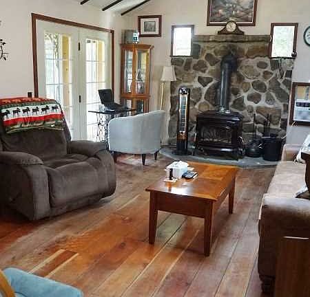 This Rustic style home is perfect for those who crave nature, peace and quiet. A covered porch welcomes you into the open Living Room featuring cathedral ceilings, wide board floors, exposed beams and a cobble stone hearth with cozy wood stove. There is an eat in Kitchen with a breakfast nook and laundry. Off the living room is a newly remodeled Bath and a Bedroom. On the second floor is a huge Master Suite with a private porch to a deck and a fabulous bath with a whirlpool tub and radiant heated floors. If you need more space the heated two car garage with a bathroom would easily allow for more square footage. Enjoy total privacy with 3.9 pretty acres with lightly wooded trails and stone walls and lovely views of the mighty Berkshires. There is a 20x14 pole barn with electric and water perfect for a hobbyist or livestock. 10 minutes to Red Hook and TSP. Perfect weekender or full time home.