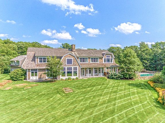 Sweet dreams are made of this! It won't be easy to click out of vacation mode in this exceptionally stylish home designed by iconic architects Demetriades & Walker, whose approach to modernism and site integration is spirited by the rich architectural traditions of the past.Characterized by smart, quality finishes, the 7,700-sqft home with in-law apartment takes its place on 20 tranquil acres edged by stone walls along one of Connecticut's finest roads. Privately accessed by a graveled drive with motorized entry gate, the 6-bedroom home is enveloped in light and comfort while providing a generosity of space for entertaining, indoor and out. Crisp white walls, walnut flooring and custom millwork throughout create an ambiance of luxury and easy living with every high-end comfort one can imagine.Interior highlights include a spacious great/room lounge with double-height ceilings, bluestone wood-burning fireplace, grand-scale windows with motorized shades, wet bar with walnut cabinetry and 2 Sub Zero beverage refrigerators. The spacious chef's kitchen features walnut cabinetry, white marble countertops, large dining area, and French doors to covered deck with full outdoor kitchen for al fresco dining. Among the designer appliances are 2 Sub Zero refrigerators, Miele dishwasher, all Wolf appliances including: 6-burner double oven with custom vent hood, Wall Oven, 2 warming drawers, built-in deep fryer, built-in steamer, and microwave. A walk-in pantry boasts Sub Zero refrigerator, Freezer, Ice Maker, and Miele Dishwasher.Additional ground level rooms comprise a family room, sitting room with custom shelving and hidden TV wall, office, laundry room with double Bosch washer/dryers, wash basin, and dog bath, mud room with Porcelain flooring, and two powder rooms with Nublado marble countertops and bibs.The second level features a grand master suite, with 2 dressing rooms and 5-piece bath including a 2-person walk-in shower, Waterworks standalone tub, marble tiles, heated floors, and access to balcony. Two Guest bedroom suites each offer a walk-in shower, marble tiles, stone countertop, mahogany cabinetry, linen closet with hamper. Two children's bedrooms share a bath with tub shower.An attached in-law apartment has a loft-style layout with full bath and bedroom with walk-in closet. A partially finished basement features a wine cellar, extra storage room and safe room.Outside, the verdant 20-acre property offers a myriad of places from which to soak up the sun and sights and sounds of the private grounds. Exterior amenities comprise an in-ground heated pool with motorized solar/safety cover, custom field stone walls, IPE wood decking, built-in irrigation and garden lighting. A covered porch houses an outdoor kitchen with bluestone gas fireplace, concealable TV, ceiling fans and heaters, a grill/smoker/rotisserie, ice maker, beer tap, sink, refrigerator, and gas stovetop.Fitted with multi-camera video surveillance system, Lutron lighting, Savant audio/visual system with speakers throughout, multi-zoned HVAC, central vacuum, lightning rods, cedar shingle exterior & roofing, copper gutters and accents, and a 3-car heated garage.This house exemplifies the personality and taste of those accustomed to the best in quality design, finishes and lifestyle. Be prepared to fall in love. Once you see it you'll want to own it. Full feature list available.