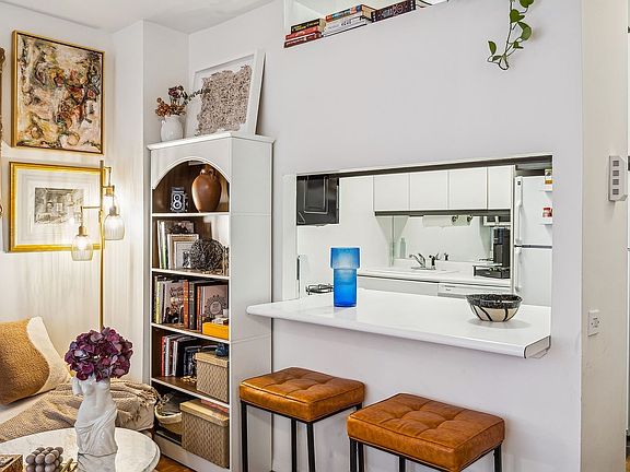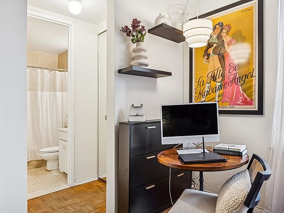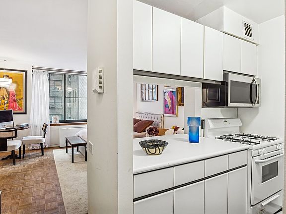 This comfortable studio at the Savannah has an open layout, with wood floors, a pass through kitchen with dishwasher, and a wall of oversized windows overlooking a quiet backyard. Want for nothing in this full service building with a doorman, live in super, fitness center, laundry on every floor and an amazing roof deck.