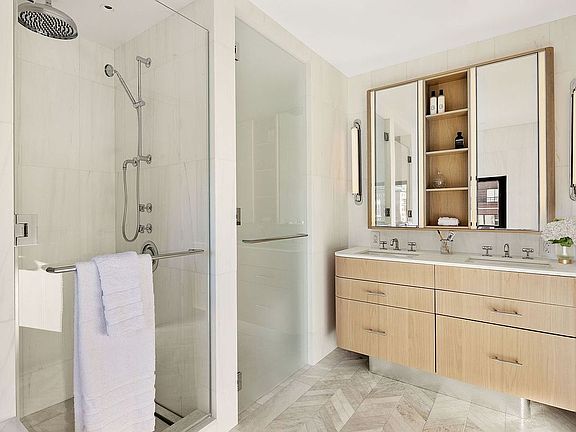 The east-facing primary suite features a dressing closet and a five-fixture en-suite bath, finished in Bianco Dolomiti marble. This luxurious bath includes a Waterworks tub, glass-enclosed marble shower, radiant heated white marble herringbone floors, dual white oak vanity with Kohler sinks, Waterworks fixtures, and a Toto Neorest commode.