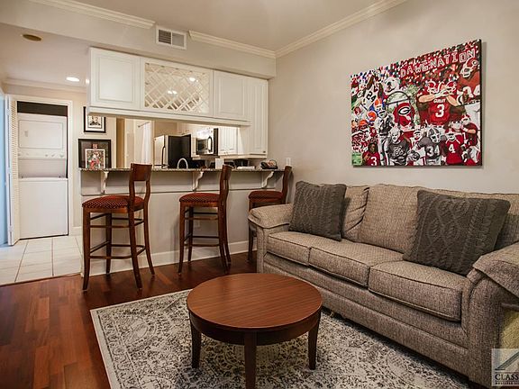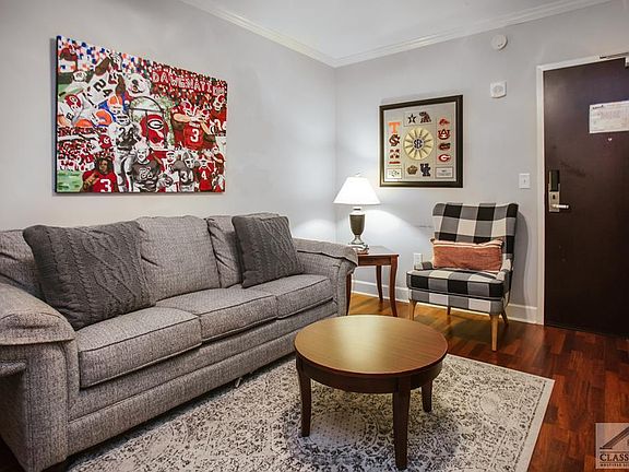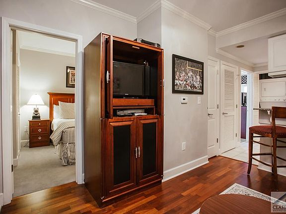 Renovated Two Bedroom Two Bath. Broad Street side with views from double covered balcony to Downtown Athens, GA & UGA Campus. Tastefully renovated with new paint & hardwood flooring in the living area. Tile in kitchen & baths. New lighting. Kitchen has white cabinets with wine rack & stainless steel appliances. All GAMEDAY condos are fully furnished with all the furniture, linens, appliances, electronics, and household items included in the price. Georgia's GAMEDAY Center is the only property in Athens, GA with 24/7 Front desk staff acting as concierge, on site housekeeping & on site handyman. Security cameras throughout the building and 5 level on-site parking deck. GAMEDAY is also the only hotel-condominium in Athens. OPTIONAL on-site management company will lease the condo for you when you are not there. The on-site management company leases nightly, weekly, monthly & long term. Walk to Sanford Stadium and UGA campus. Association dues cover water, sewer, trash pick up, common area maintenance, insurance on building, hi- speed internet access, extended satellite television, security, and parking.