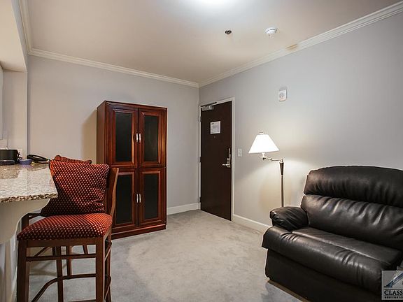 GAMEDAY Condo Suite 513. One bedroom, one bathroom condo with numbered, reserved space in onsite covered parking deck. View from balcony towards the East, towards Downtown Athens. This condo was never in the rental program. Gently loved by Seller, who stayed approximately 2 weekends per year since 2004. All GAMEDAY condos are fully furnished with all the furniture, linens, appliances, electronics, and household items included in the price. Georgia's GAMEDAY Center is the only property in Athens, GA with 24/7 Front Desk staff acting as concierge with on site housekeeping & on site handyman. Security cameras throughout the building and 5 level on-site parking deck. GAMEDAY is also the only hotel-condominium in Athens. OPTIONAL on-site management company will lease the condo for you when you are not there. The on-site management company leases nightly, weekly, monthly & long term. Walk to Sanford Stadium and UGA campus. Association dues cover water, sewer, trash pick up, common area maintenance, insurance on building, hi- speed internet access, extended satellite television, security, and parking.