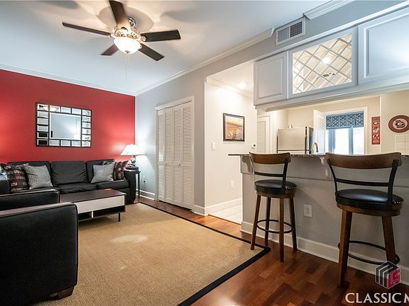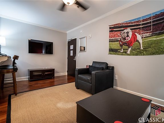 Upgraded fully furnished 1BD/1BA in Gameday and one of the largest one bedroom units in the building! This unit features beautiful LVP flooring, living room, kitchen with granite counters, tile backsplash, stainless steel appliances and custom cabinets, laundry closet, bedroom with private balcony and bathroom. Gameday offers 24/7 front desk staff, housekeeping and on site management that will lease your unit while you are not occupying it. This is perfect for UGA football fans looking for a place to stay for football weekends, parents who are tired of searching for hotels to visit their UGA student children, or anyone who wants to live the downtown life full time!