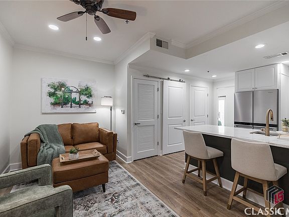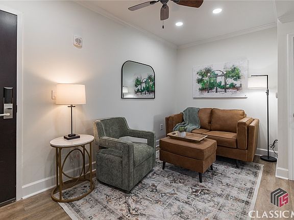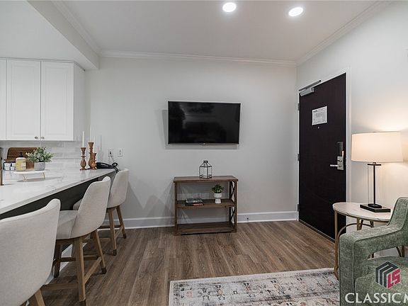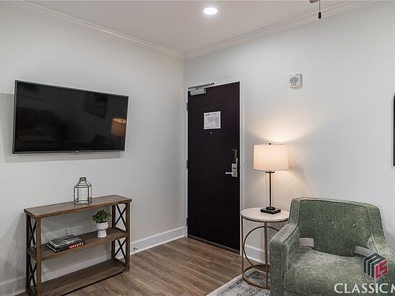 Premier 1 Bedroom, 1 Bath with complete contemporary renovation. Clayton Street with balcony/ view to the North. GAMEDAY ~ The place to be on football Saturdays! New flooring and modern lighting throughout. Kitchen has stainless steel appliances (including extra large fridge and dishwasher), white cabinets, and quartz countertops. New full-sized Samsung washer/dryer. Bath has full tiled shower, glass enclosure, lighted vanity mirror, and brass fixtures. Bedroom features stunning panel wall. Georgia's GAMEDAY Center is the only property in Athens, GA with 24/7 Front Desk staff acting as concierge with on-site housekeeping & on-site handyman. Security cameras throughout the building and 5 level on-site parking deck. GAMEDAY is also the only hotel-condominium in Athens. OPTIONAL on-site management company will lease the condo for you when you are not there. The on-site management company leases nightly, weekly, monthly & long term. Walk to Sanford Stadium and UGA campus. Association dues cover water, sewer, trash pick up, common area maintenance, insurance on building, high speed internet access, extended satellite television, security, and parking. Seller will occupy through November 14, 2023.
