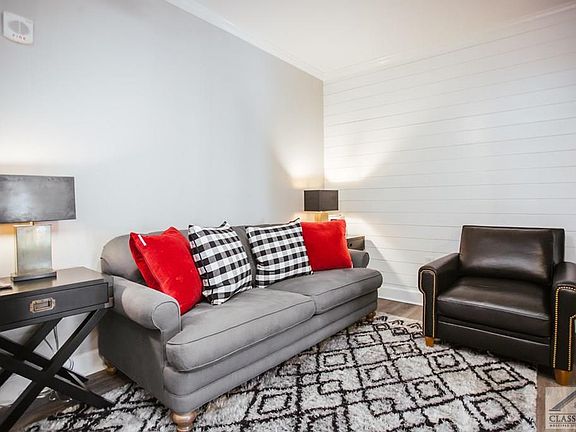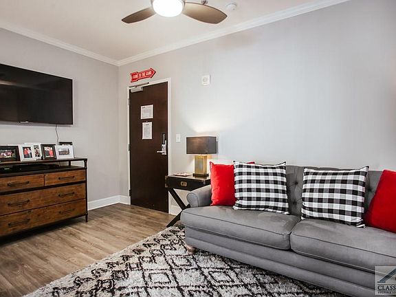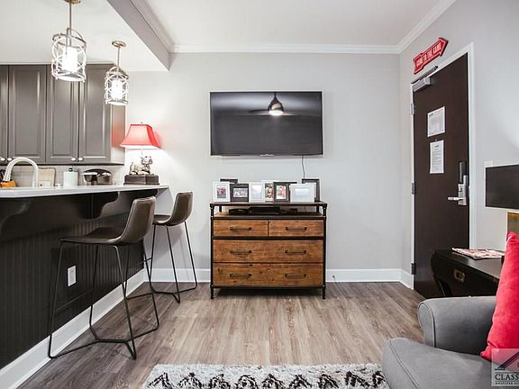 Downtown Athens, GA view! Fully Renovated One Bedroom One Bath Condo. Corner Suite with view from balcony toward the Arch & Sanford Stadium. Beautifully renovated with ship lap wall accent, new furniture, flat screen televisions & paint throughout. New flooring in living area and bedroom. Bright new lighting. Kitchen has new stainless steel Whirlpool appliances, tile back splash, dark grey cabinets & marble counter & bar tops. Bathroom has new flooring, vanity, glass shower doors, tiled shower, plumbing and electrical fixtures. All GAMEDAY condos are fully furnished with all the furniture, linens, appliances, electronics, and household items included in the price. Georgia's GAMEDAY Center is the only property in Athens, GA with 24/7 Front Desk staff acting as concierge with on site housekeeping & on site handyman. Security cameras throughout the building and 5 level on-site parking deck. GAMEDAY is also the only hotel-condominium in Athens. OPTIONAL on-site management company will lease the condo for you when you are not there. The on-site management company leases nightly, weekly, monthly & long term. Walk to Sanford Stadium and UGA campus. Association dues cover water, sewer, trash pick up, common area maintenance, insurance on building, hi- speed internet access, extended satellite television, security, and parking.