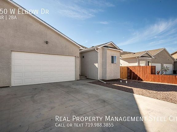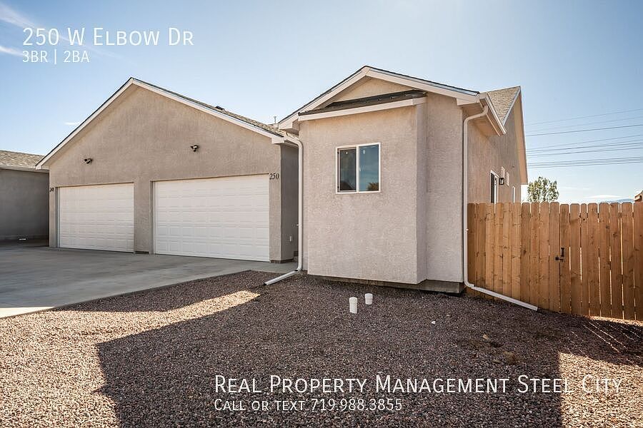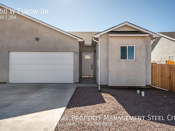 This recently built duplex unit combines modern style with practical features in a prime location near Lake Pueblo State Park. Enjoy an oversized two-car garage for ample parking and storage. The kitchen boasts granite countertops, a gas stove, and all stainless steel appliances. A sliding glass door leads to a fully fenced, low-maintenance yard, perfect for outdoor relaxation. The first bathroom includes a beautifully tiled, walk-in shower, while each of the three bedrooms is spacious and filled with natural light. The primary suite offers a private bathroom with a tiled tub and shower, dual vanity sinks, and a large walk-in closet. Step out to the backyard and enjoy stunning views of the Sangre de Cristo Mountains, with outdoor recreation at the reservoir just a short drive away. None