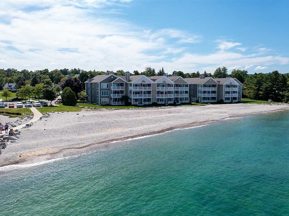 Premier waterfront 2-bedroom condo with 580 ft of shared Lake Michigan frontage. Spacious unit on the 2nd floor, with amazing views and sunsets with a covered porch and sunroom. This condo also features a one car garage, tennis court and elevator. Enjoys views of the marina, light house and walking distance to downtown restaurants and shopping. Open house Saturday August 21st Noon - 2pm