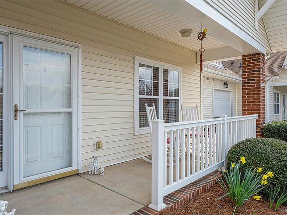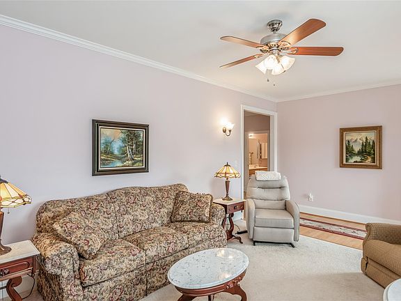 Village of Woodridge is a 55 plus community with an active clubhouse and activities. 5 meals weekly included with HOA dues. This is the largest floorplan in the community! Enter from the covered front porch into the spacious living room with custom built-in shelving unit. The Kitchen features 42-inch cabinets and granite counters with tile backsplash. There is also a new dishwasher, with refrigerator, smooth top range and microwave with abundant storage and walk-in pantry. Dining area and den are light and bright with a wall of windows. Double French doors open to the Sunroom that would also work well for a home office and opens to the patio. New stack LG Laundry center. Primary bath has a double vanity and 5-foot shower with comfort height toilet. Extra wide doors and zero threshold from oversized garage that includes a storage area. Exterior maintenance, Landscaping and pest control included in HOA dues.