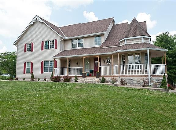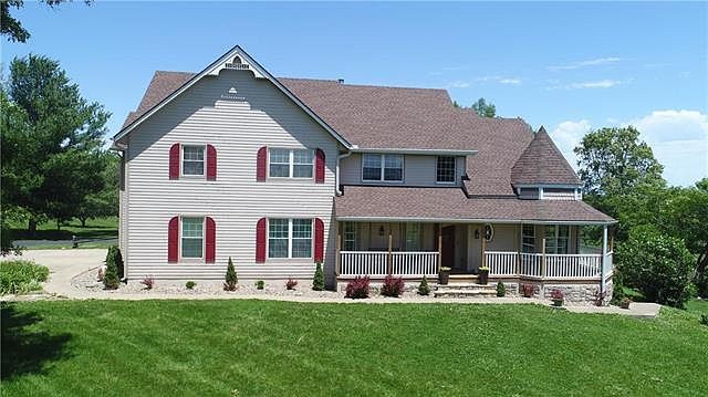 Perfect Country Setting on 4.98 acres w/Outbuilding, Beautiful Landscaping, Stunning flagstone patio w/custom firepit, Charming Front porch, Asphalt driveway, Mature black walnut grove trees, Giant Walk-in attic, Media rm, Office, & close to town! So much to mention:Beautiful kitchen/din rm w/soaring ceilings Granite counters, Wine bar, Hardwoods, Double Oven, S/S Samsung appl.-All stay! Nice master w/walk-in-closet, double vanities, soaking tub, nice tile. Huge Living rm w/Custom Window, wood stove, crown molding!