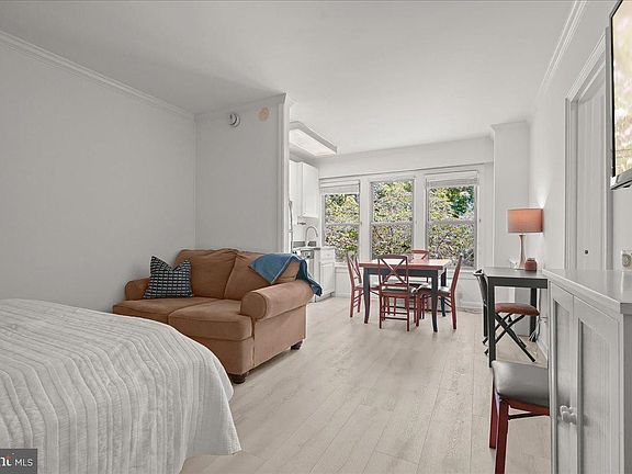 Discover unparalleled value in Georgetown with this charming move-in ready condominium, perfect for first-time homeowners, savvy investors, or those seeking a pied-à-terre. Recently refreshed with new paint, new flooring, and additional numerous updates, this residence promises modern comfort and style. Step inside the living space to find new luxury vinyl plank flooring and a stunning Oak built-in king-size Murphy bed, complemented by a convenient entry closet. The kitchen is equipped with stainless steel appliances, including a full-size fridge, microwave, dishwasher, and oven. Designed for efficiency, the smart layout seamlessly connects the dining area to the kitchen, bathed in natural light from three large windows with serene treetop views of Rock Creek Park. A spacious walk-in closet adjoins the bathroom for ample storage. Additional comforts include radiator heat and a built-in wall A/C unit. The reasonable monthly condo fee covers all utilities except cable/internet. Located in Georgetown’s coveted East Village, this building also offers effortless access to DuPont Circle, with renowned restaurants, shops, and amenities in both Georgetown and DuPont nearby. Gateway Georgetown provides a suite of amenities including a 24-hour front desk, on-site management, a secure bike room, office/community room, fitness center, rooftop deck, and laundry facilities. Don’t miss the opportunity to own the lowest priced unit in Georgetown. Experience the exceptional lifestyle this home offers!