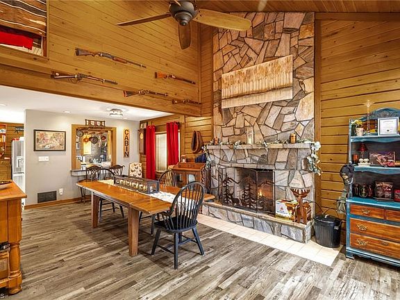 This is what you have been looking for! Welcome home to this stunning 2 bedroom, 2.5 bathroom log cabin-style retreat, perfectly situated on a spacious lot just shy of an acre. Nestled in a prime location near all amenities, this home offers the perfect blend of rustic charm and modern convenience. Step onto the rocking chair front porch and take in the peaceful surroundings before entering the home, where you'll find vaulted ceilings and a huge den with a cozy sitting area, perfect for relaxing by the wood-burning fireplace. The eat-in kitchen provides plenty of space for family meals, while the spacious bedrooms upstairs ensure comfort and privacy. Downstairs, a recreation room in the basement offers additional living or entertainment space. The two door garage and long, spacious driveway provide ample parking, while the back deck overlooks a massive backyard... ideal for outdoor gatherings, gardening, or simply enjoying nature. Large shed will convey.