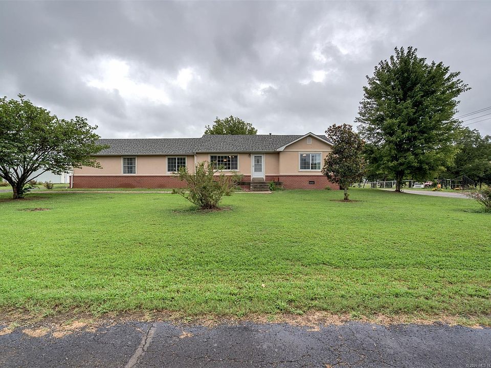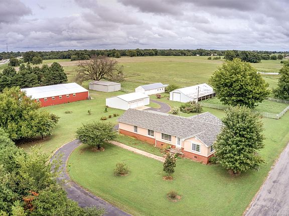Home sits on 16 acres just off Highway 69 north of Pryor. Spacious 3 bedroom, 2 bath, 2 living areas and a large covered back porch. Property features a detached 3 car garage, 80x70 barn with tack room and attached 15x40 enclosed shop, 38x23 loafing barn with electric and water, 77x20 hay barn with attached 21x12 storage barn, 16x50 dairy barn, lots of pipe fencing and a large pond.