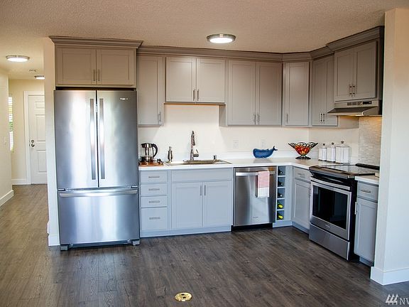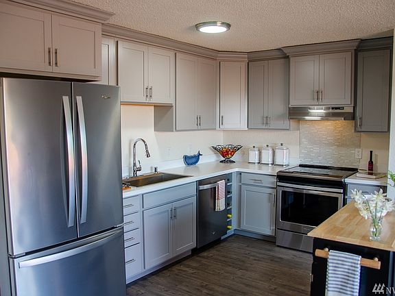 Fully renovated from the walls-in with amazing panorama views! Floor level unit with a open kitchen layout featuring motion activated faucet, wine rack, and new Maytag appliances. Enjoy the soft close drawers and handles throughout. Floating island concept with floor power. Water resistant laminate flooring. Fully renovated bathroom with taller toilet and dual vanity pull out shelf and power bar. Fenced off back yard and conveniently located for Angle Lake Light Rail, I-5, and Hwy 167.