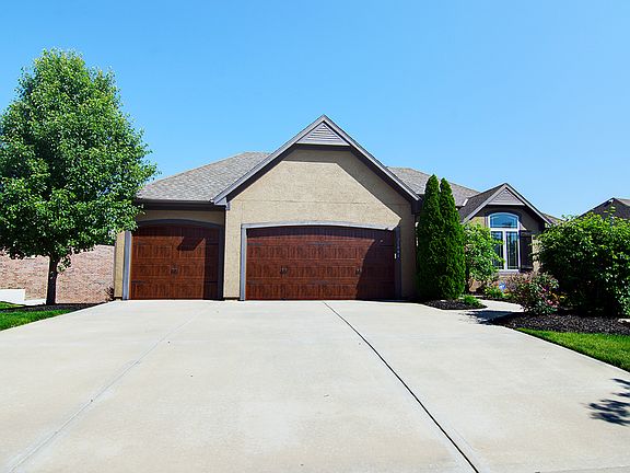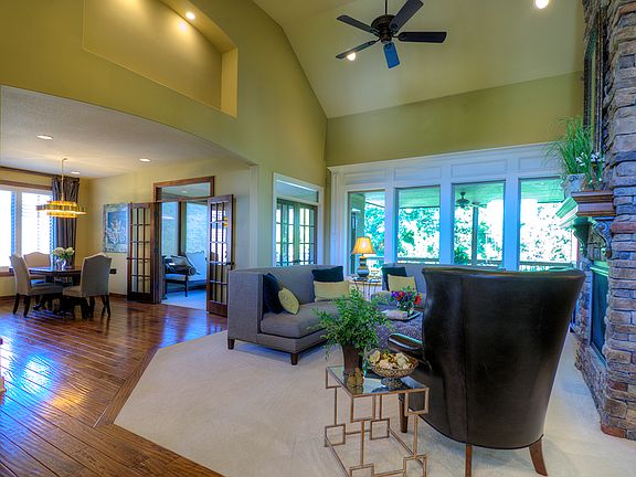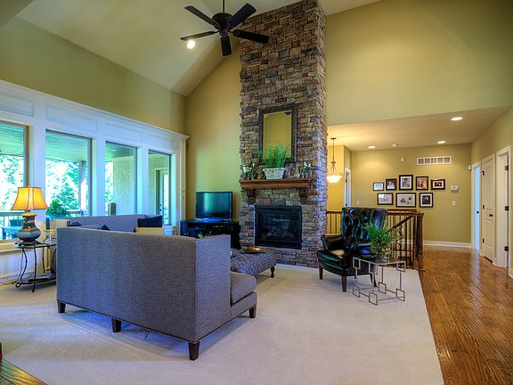 Incredible Tree Top Views in this Ranch/Reverse 1.5 Story Home: Move in Ready! New Carpet and custom Plantation Shutters Upstairs! New Garage Doors! Nearly 3700 sq. ft. of living space. Beautiful eat-in kitchen with granite, oversized island/breakfast bar, generous pantry and dining area with new designer chandelier. Separate office/sun room with access to covered deck. Great room with soaring ceiling, impressive stone fireplace and peaceful views. Master bedroom with sitting area, fireplace, with access to covered deck. Spa-like bath with jetted tub, oversized walk in shower and dual vanity. Finished walk out lower level, featuring stone and concrete wraparound bar, 12 x 8 wine cellar/storm shelter, 2 bedrooms, full and half bath. Cedar Closet and plenty of storage. Custom window treatments throughout house. Full stucco on exterior, sprinkler system, alarm system, decorative dry creek bed with river rock. Don't wait for new! Higher quality at a better price point.