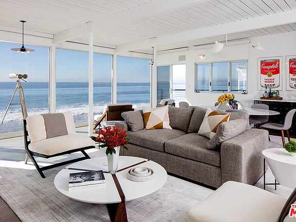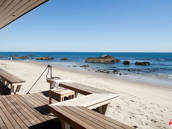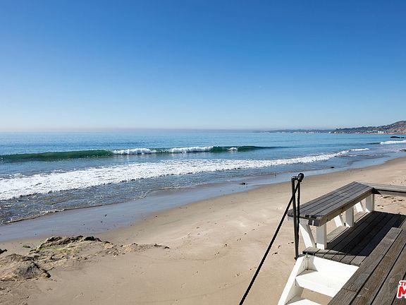 If you're looking for a gem on the beach, this chic and polished Malibu Rd. beach house is the perfect fit. A gorgeous home located on a prime stretch of sandy beach on coveted Malibu Rd. It features an open floor plan with nearly every room facing stunning white water views, there's a subtle mix of wire brushed oak floors w/ modern finishes giving a warm yet contemporary vibe, a spacious designer inspired living room is the perfect place to relax with a separate downstairs entertainment lounge for movies and ping pong, custom gourmet kitchen with slate grey countertops plus top of the line stainless steel appliances, an ocean front master w/ generous walk-in closet, spa bath and private terrace. There are two addtl guest bedrooms in main house & large teak wood deck on the beach. Also, a beautiful detached guest house with stunning ocean views, plus gym, 2 car garage, tropically landscaped grounds and a big backyard courtyard for additional outdoor entertaining and parties.