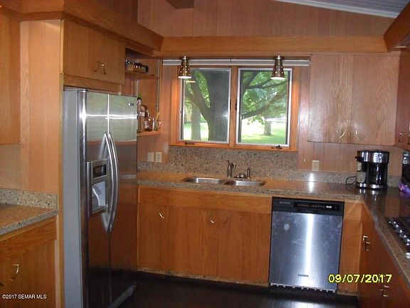 Mid-century home in nice location with fenced yard and double attached garage. Home boasts vaulted ceilings, floor to ceiling double fireplace, updated kitchen with SS appliances, quartz counters, oak and cork flooring.