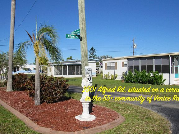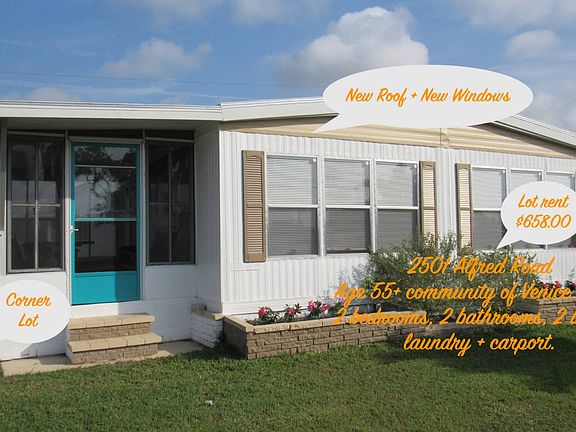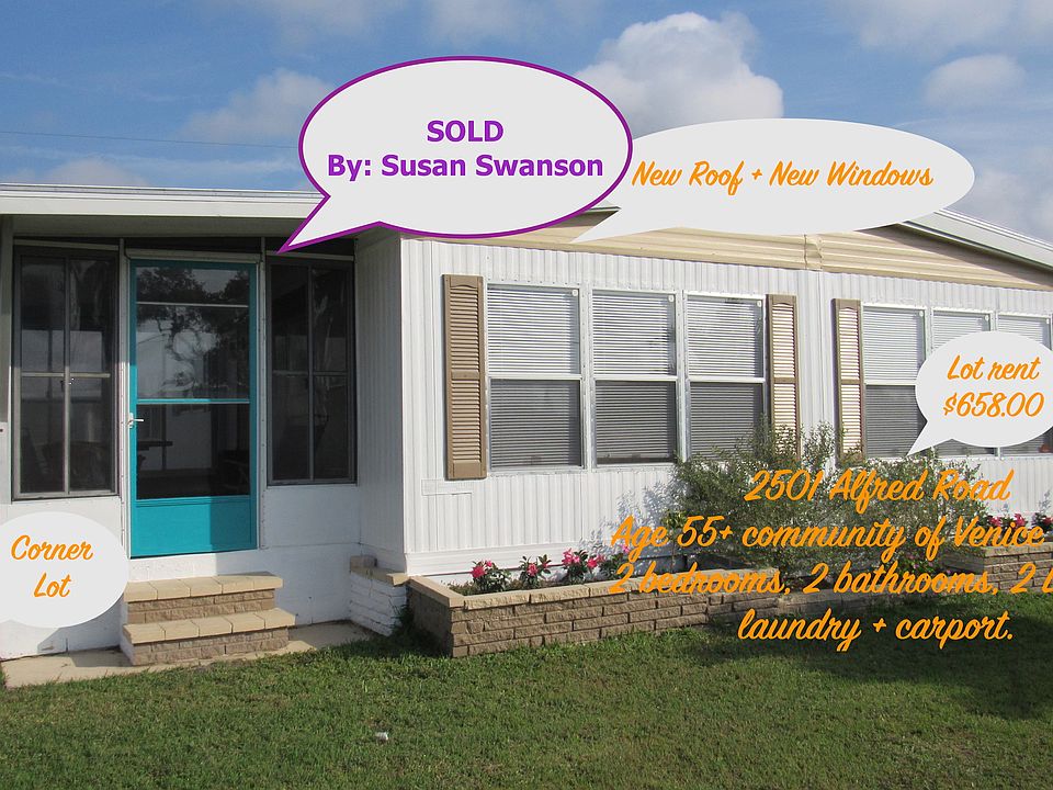 PURCHASE IS PENDING ON THIS HOME. BUT, IF YOU'RE HOUSE SHOPPING, CONTACT ME. AND, BE SURE AND CHECK OUT MY YOU TUBE CHANNEL. VIEW HOMES WHILE STAYING IN YOURS. Seeking a Venice Avenue address? If so, perhaps this home in the 55+ Community of Venice Ranch is for you. 2501 Alfred Road is situated on a corner lot and offers more than 1100 square feet of space. Corner lot. Monthly fee of approximately $658 includes water, trash and sewer. The home provides a combined living and dining room and a Florida room on the west side. Off the dining room you'll find a clean white kitchen with updated cabinets and appliances. From the kitchen entrance you have easy access to the carport and the exterior patio space where you'll also find a laundry room. The home also has two full bathrooms and two bedrooms each with their own closet spaces. Beside a New Roof and all New Windows, the home is also lit with all new LED lights. The community of Venice Ranch offers a Solar Heated Pool, Shuffleboard, a Clubhouse for Social Gatherings and on the far south corner, you'll find a Pergola for your picnics and BBQ's. The Gulf of Mexico is a short 4 mile drive to find Venice Beach and just 10 minutes further Casey Key Beach. This Seller wants a Sold Sign in the Yard. See 2501 Alfred Road in Venice today.