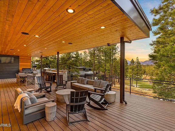This modern 5-bed, 4.5-bath sits on a premier lot overlooking the award winning 18th hole at Pine Canyon Golf Course. Featuring a dazzling stone fireplace and expansive deck showcasing stunning views of Humphrey's Peak. The chef's kitchen boasts top-tier amenities, while the main level hosts a guest room and a master suite with a fireplace and lavish bath. The lower level offers a second family room, 2 guest rooms, and a junior master suite. Features include surround sound, a 3-car garage, and direct access to Pine Canyon's 18th-hole view and sledding hill from your backyard.