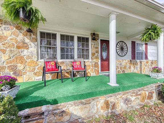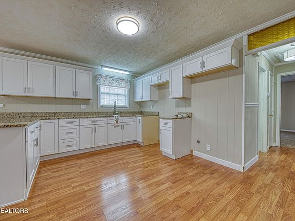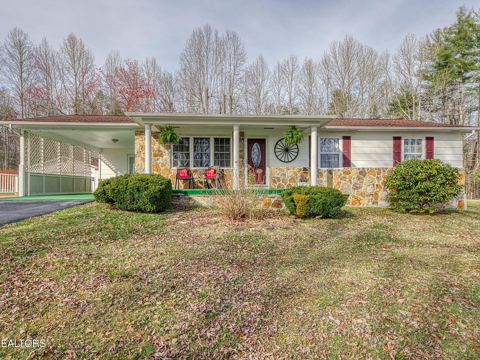 Ranch home sitting on beautiful 3.3+/- acres lot with 24'x 26' 2 car detached garage. 3 bds with 1 ba.. Attached 1 car carport, detached 10' x 20' shed with electric, and detached 9' x 9' shed. Partial wraparound porch from side to rear, covered front porch, stone accents on home, vinyl replacement windows, laundry/mud room with door to carport. New HVAC and duct work. New kitchen appliances will be installed before closing. Perienial Gardens throughout property. 20 mins Oak Ridge, Near ATV Trails.