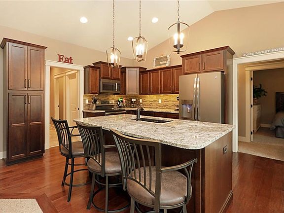 Over 3,000 sq ft finished! This 1,757 sq ft, 5-bedroom ranch sits on a cul-de-sac and backs to a tree line. That is right!! No neighbors behind you. The main level features a large master bedroom with a trayed ceiling. The master bathroom is complete with his and her sinks, a full tiled shower and a large closet. The other 2 bedrooms on the main floor share a Jack and Jill bathroom. The main living area has a floor to ceiling stone gas fireplace and features hardwood floors throughout the high traffic area. The kitchen is complete with a large island, granite counter - tops, tile back splash, and slate finish appliances. A large pantry is located off the kitchen. Sit out on your oversized deck that overlooks your fenced in back yard. The 1300 sq ft finished basement has 2 large bedrooms, a large family room, and wet bar. Perfect for entertaining. Additionally, this home has a 12 x 12 shed and an oversized, heated 3 car garage with epoxy flooring.