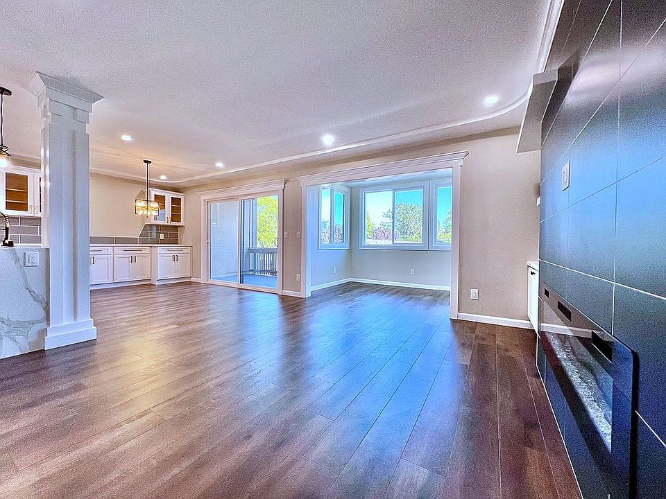 Newly renovated Rossmoor condo with 2 bedrooms and 2 full baths offers modern living with a touch of elegance. Completely updated with new windows, doors, wood flooring, inset ceilings with two-zone lighting per bedroom, and more. An open layout invites you into a spacious living room and dining area with eastern views through the terrace and a sun-drenched office. The living room has a modern electronic fireplace offers visual interest, heat, and safety, framed by built-in shelves. A newly remodeled kitchen is updated with a side-by-side refrigerator, dishwasher, and stove with a pot-filler faucet on an articulated arm. A kitchen island features waterfall marble countertop, a versatile industrial sink with built-in drying grid and cutting board, matching brass accents, room for bar stools, plenty of cabinets. Two full bathrooms offer a full-size bath tub and expansive shower respectively, mirrors with built-in lighting, new toilets, and elegant marble counters. Additional features include in-unit washer and dryer, a carport with power for golf-cart parking. The carport is located steps away from the unit.