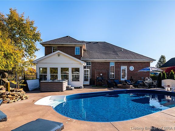 You'll feel right at home in this beautifully maintained home. Gorgeous hardwood floors, freshly painted & ready to call HOME. The stately Living Rm affords plenty of room for your family/friends to chill by the gas fireplace. A spacious kit with double ovens, 5 burner stove is just steps away. A large granite island can easily seat family for casual dinners. Need a more formal setting? The DR provides plenty of space! Pantry, laundry w/utility sink is located between the kit & garage. Easily carry groceries in from the garage with EZ care epoxy flrs. Primary suite is on the main level w/walk in closet. Work from home in the beautiful office on the main flr. Kiddos have their privacy with 3 BRs upstairs & full ceramic bath. Lower level Fam Rm features a vast amt of entertaining space. Guests will enjoy shufflebd, 2 player arcade, foosball or round of pool in game room. Get your workout on in the 5th BR (lower level) currently an exercise haven w/padded flooring. Convenient full bath downstairs! Tons of storage in LL. Sunroom leads to the Pool Oasis w/hot tub, firepit & fountain! Enjoy peaceful evenings or celebrate family events w/pool parties galore. This home will easily accommodate your family thru the yrs. Perfectly situated on dead end w/privacy from adjacent wooded lot & 3 Acs behind. Lake access w/fishing, walking trail, sidewalks, etc. Highly sought after Silver Creek schools. Close to Schools, I-65 & I-265, shopping, restaurants...so much to offer! Sq ft/rm sz appx.