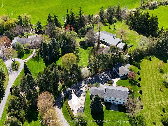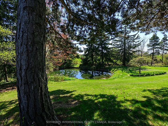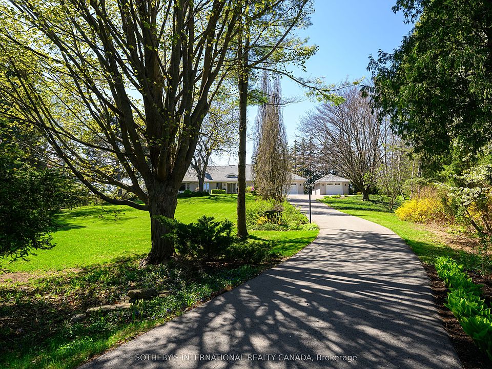 Follow the winding 400-foot paved driveway and discover a world of privacy, elegance, and serenity all just minutes from the city. Nestled on 1.66 acres of beautifully secluded land, this extraordinary home feels like a countryside retreat, yet it's only 2.5 km from Hwy 5, 3 km to Hwy 407, and close to major shopping and conveniences. Step inside and be charmed by nearly 4,800 sq ft of exquisitely finished living space. The grand foyer greets you with a vaulted ceiling that soars and opens to the second floor, creating an impressive sense of space and elegance, setting the tone for the home's thoughtfully designed interior. Crafted for those who appreciate timeless beauty and detail, every room tells a story from rich 3/4" oak hardwood floors, custom millwork, with elegant crown molding through-out to oversized windows framing peaceful, ever-changing views. At the heart of the home, the modern-classic kitchen blends premium appliances with inviting warmth. Enjoy sunny mornings in the cozy breakfast nook and host elegant dinners in the formal dining room. The main floor offers a graceful flow with a living room, family room, and a versatile bedroom with a 4-piece bath perfect for guests, a home office, or in-laws. The primary suite is a true sanctuary, featuring a spa-like ensuite, a custom dressing room, and French doors that open to a private patio perfect for morning coffee or stargazing. Upstairs are two spacious bedrooms, a well-appointed bathroom, and a skylit bonus room ideal as a studio, den or potential fifth bedroom. The lower level includes a large rec/games area, a workshop, and ample storage. Outside, unwind on tranquil patios surrounded by lush landscaping, mature trees, and a serene pond teeming with carp. This is more than a home it's a feeling. A rare blend of quiet luxury, natural beauty, and modern convenience. Come experience it for yourself.