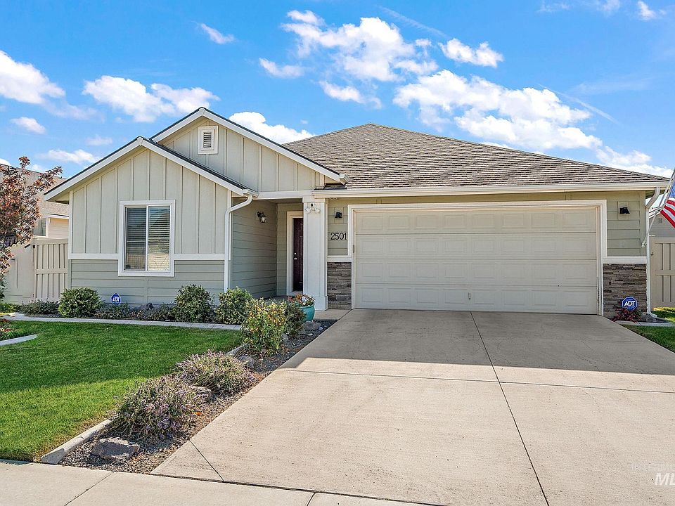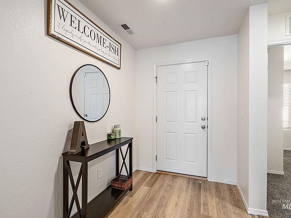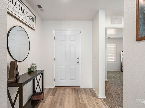 Welcome to this bright and inviting 3 bed, 2 bath home located in the highly sought-after Crimson Point Community in Kuna. This charming property boasts a spacious open-concept layout, perfect for entertaining and everyday comfort. Large windows flood the space with natural light, creating a cheerful and welcoming atmosphere throughout. You will notice the extra can lighting added in the living room and bathrooms, enhancing the home's already bright and airy feel. The split bedroom floorplan offers both privacy and functionality. Step outside to find an extended patio, ideal for evening relaxation and outdoor gatherings. The entire interior has been freshly painted in a crisp, modern white, giving the home a clean and vibrant look. The Crimson Point Community features a refreshing seasonal pool, beautiful parks, and an elementary school nestled within the community, making it an ideal location for anyone. Home Warranty included with full price offer! Tour today!