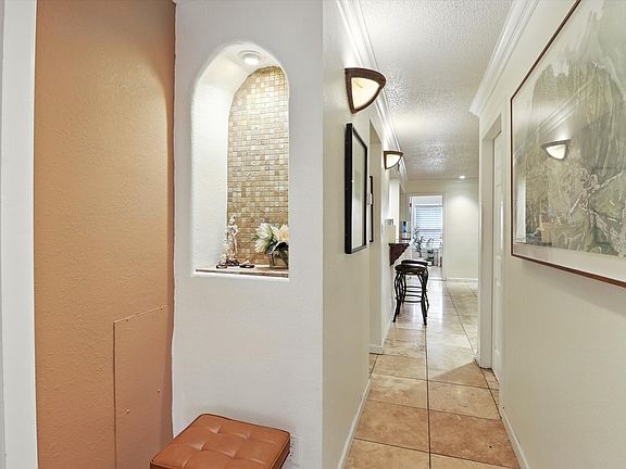 Additional features include tile and travertine flooring, ceiling fans, storm doors, nichos, and in-unit washer/dryer. Bathrooms feature stylish tile counters and tub enclosures.