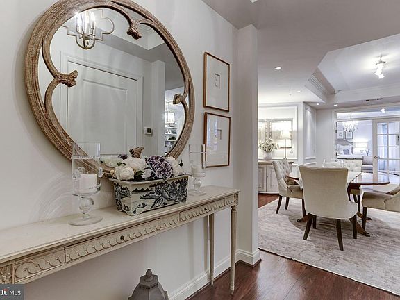Private elevator entry from garage and main level access -- no stairs to climb. Exceptional, 1,800 SF turn-key 2 BR/2 BA flat is tastefully finished with quiet courtyard views. Open living room has built-ins and gorgeous marble surround fireplace. Dining room/library leads to gourmet kitchen with breakfast bar, Viking and Bosch stainless steel appliances and laundry room. French doors frame the en suite master bedroom with walk-in closet. Second bedroom has double closet and hallway full bath. Lovely details include high ceilings, paneled walls and hardwood floors. 2 garage parking spaces (53 & 54) and storage convey. Amenities include roof deck, garden patio and lobby attendant Monday-Saturday. Condo permits one pet of any size or two with Board approval. Stroll Wisconsin Avenue to Trader Joe's, Glover Park & Cathedral Commons restaurants & shops. Whole Foods opening soon. By Appointment.