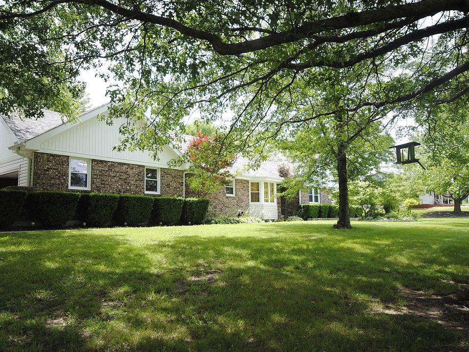 Large ranch home just outside city limits on 2.57 acres with many recent upgrades . Living room with cathedral ceiling , floor to ceiling brick fireplace with propane gas logs . Double doors to deck and patio. Large eat in kitchen with bay window , new sink and 1hp garbage disposal. Culligan water softener with reverse osmosis water purification system. Main floor washer dryer hook ups . Ceramic tiled floor in the 26x34 lower level Rec room with floor to ceiling brick fireplace with wood stove insert . Chimney has been relined with stainless liner . New Heat pump, vinyl siding , windows , exterior doors & guttering all installed in 2014. Architectural shingled roof in 2013. Shady rear patio and deck with built in seating and 6 stall horse barn with water and electricity.