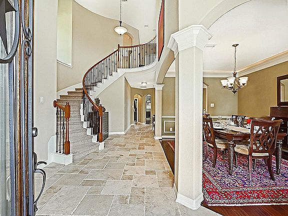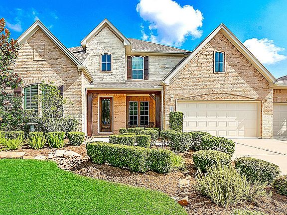 No Harvey flooding! Stunning 2-story former model on corner lot close to rec facilities. Grand entry w/ spiral staircase, 2-story family room w/ fireplace, over-sized game room w/ dry bar, media room w/ SS speakers, study w/ plantation shutters & finished bonus room off garage. Travertine floors down, granite throughout, upgraded lighting, SS appliances & whole house built in speaker system. Lavish master suite w/ garden tub, walk-in shower & spacious closet. Sprinkler system & covered patio.