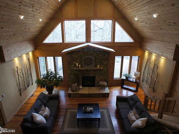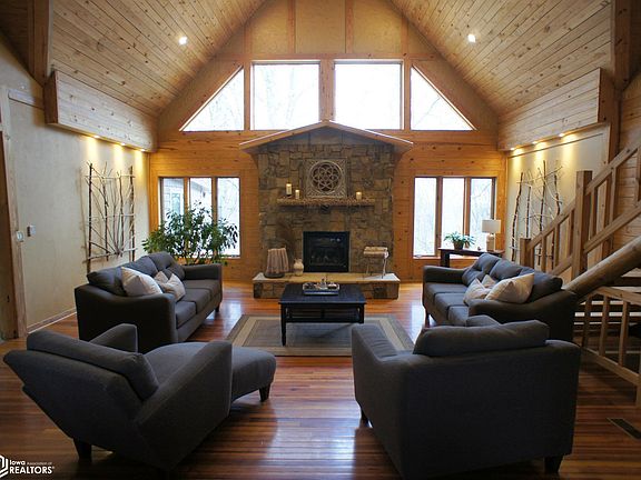 Unbelievable log home just south of Webster City surrounded by beautiful timber. Incredible outdoor spaces with a wrap around front porch, back patio with firepit and lower walk-out patio with firepit. Anywhere that is not log home is the vinyl shake siding. Home was built in 2002 and is 2668 sq. ft. not counting almost an entire finished basement. Large front entry area with half bath opens to a huge vaulted ceiling living room with real stone gas fireplace. Hickory kitchen is open to dining room. All appliances can stay. Also has 13 X 20 knotty pine three season sunroom. Large breezeway between garage and house with custom built gardening workbench and custom painted mural wall. Primary bedroom on main floor with large full bath with jacuzzi tub and separate walk-in shower. Two spare bedrooms upstairs with at 3/4 bath and a 4th bedroom in basement with a 3/4 bath. Well water and outdoor wood burning boiler help keep utilities low in this spacious home!