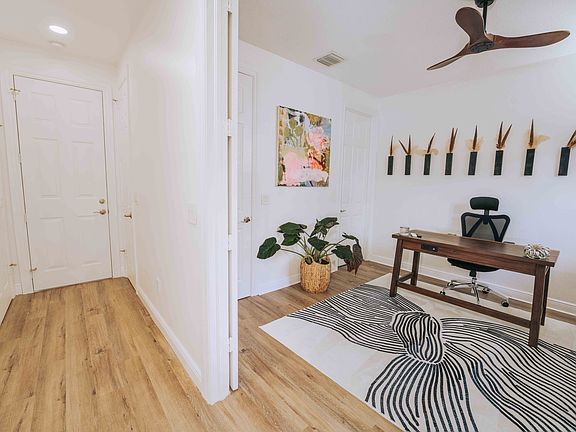 This unique, furnished three-story townhome boasts spacious bedrooms, each with an ensuite bathroom, a two-car garage, a balcony overlooking the pool and designer touches throughout. Relax in the Boho vibe throughout this comfortable home. The top story has two bedrooms, each with walk-in closets and private bathrooms, and the third bedroom is set up as a den, with a desk and queen sofa bed, and features a private bathroom with a shower. The second floor contains the living areas, featuring a spacious sectional sofa as well as a 75" Samsung Frame TV. The dining area comfortably seats six, and extra table leaves and chairs will accommodate 8. The kitchen is light and open with Samsung Bespoke White Glass Smart Appliances. New LG Smart Laundry Tower and Smart High-Capacity Water Heater.